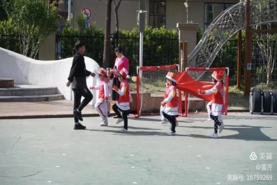 升旗仪式第一项,升国旗奏国歌。两位升旗手和四位护旗手,迈着整齐的步伐将国旗护送到旗杆下。在老师的帮助下,国旗缓缓升起。在场的所有小朋友行注目礼,注视着国旗在空中飘扬。